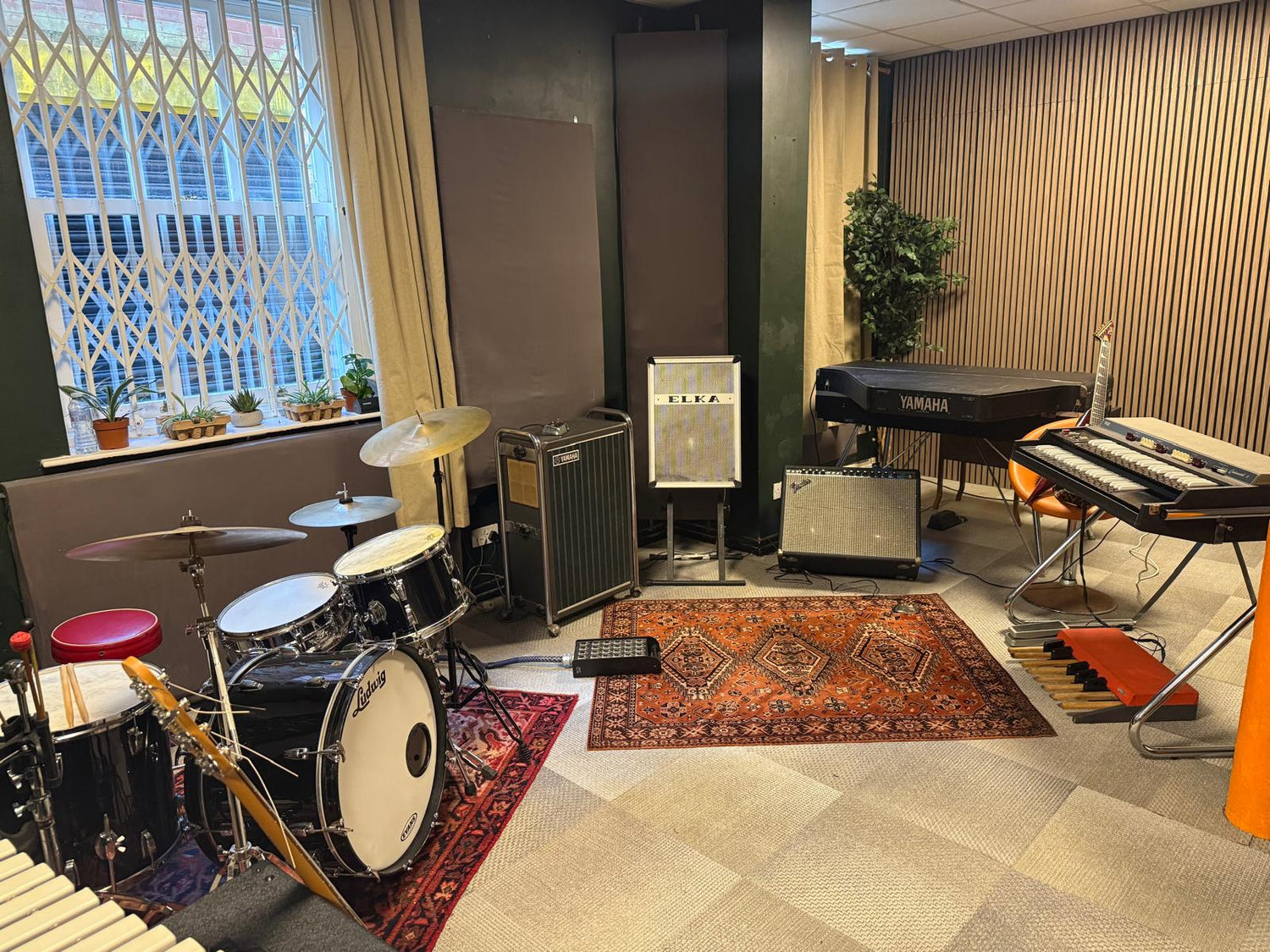 Our live room sound treated with acoustic ceiling tiles and sound absorbing flooring. opened in October 2025 the live room is routed to our mixing console and features a range of classic microphones, amps and a Ludwig 1960s Super Classic Drum kit.